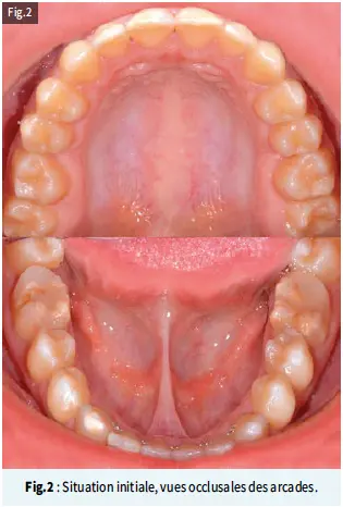 À l’examen clinique, la patiente présente des taches à l’opacité délimitée, de différentes nuances colorimétriques au niveau des incisives maxillaires avec une structure amélaire hypominéralisée particulièrement poreuse sur 11 et 21 (Fig.1).